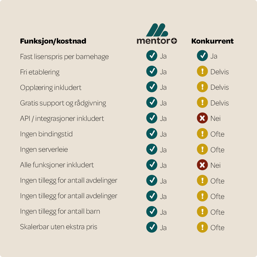 Hos Mentor forholder du deg til én pris. Du får gratis opplæring, support og oppgraderinger. Ingen skjulte gebyrer, ingen uforståelige moduler. Bare alt du trenger for å ha kontroll.